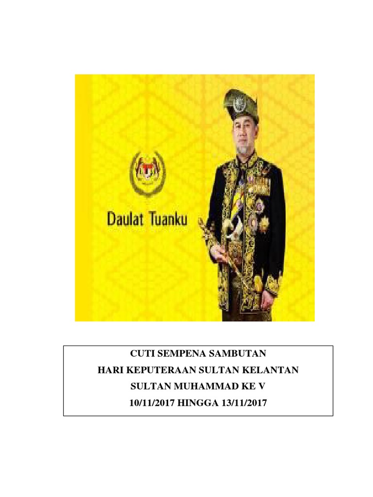 Dymm sultan sharafuddin idris shah alhaj sultan selangor istana alam shah 6 jun 2021. Beberapa hari lepas seluruh rakyat kelantan bercuti sempena keputeraan sultan kelantan, sultan muhammad ke v. Tarikh baru bagi sambutan hari keputeraan sultan kelantan iaitu sultan muhammad v telah dipinda ke tarikh baru iaitu pada 11 dan 12 november. Baginda bertitah sempena istiadat pengurniaan darjah, bintang dan pingat kebesaran kelantan sempena hari keputeraan. Pemegang amanah yayasan sultan kelantan darulnaim berdaftar.